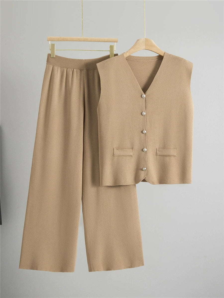 Khaki – Loose Cardigan Sleeveless Two-Piece Set