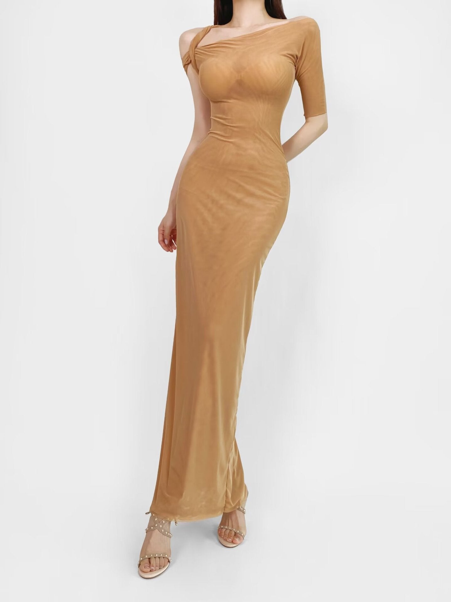 Effortlessly chic and irresistibly sexy, the Khaki Slim Fit Bodycon Dress is designed to hug your curves in all the right places. This pull-on style dress features a diagonal neckline that adds a modern twist and accentuates your shoulders. The bodycon silhouette paired with cap sleeves enhances the feminine shape while offering comfortable wear. Made from a soft, breathable blend of viscose (regenerated fiber) and polyester, it’s a versatile choice for parties, dinner dates, or a night out.