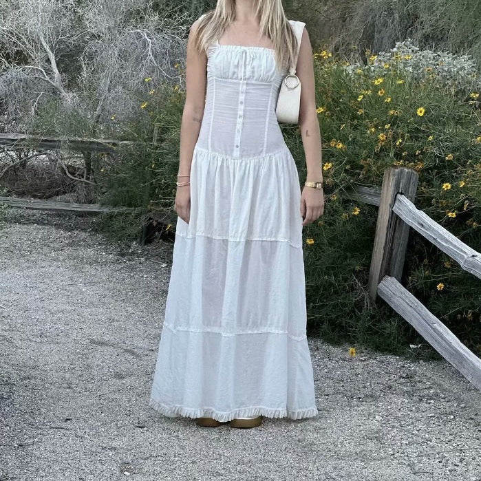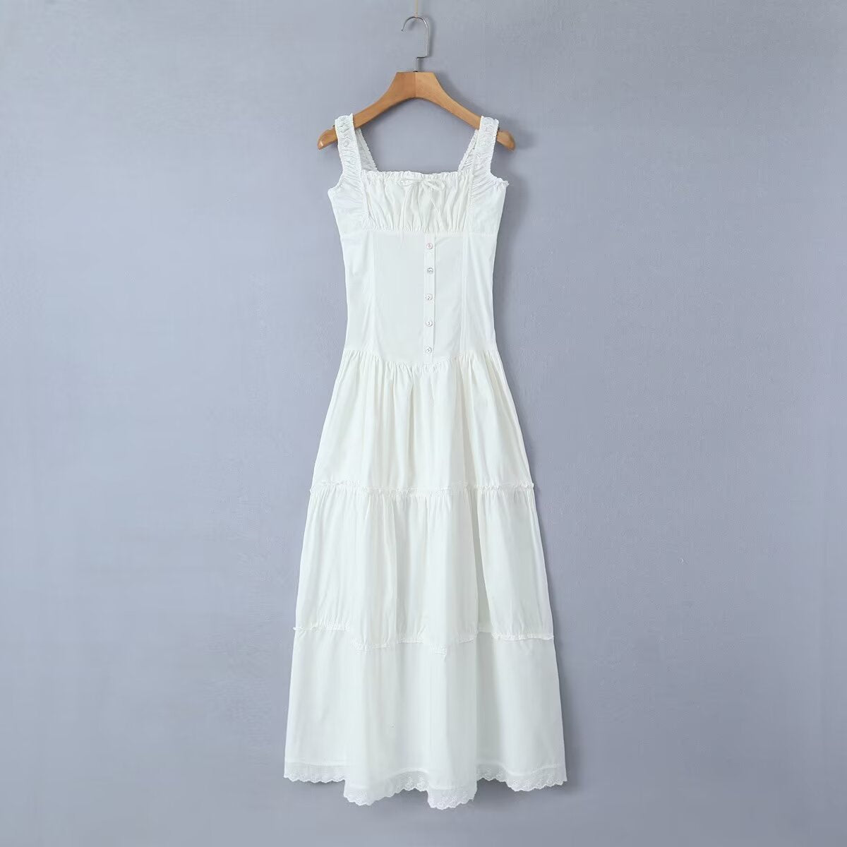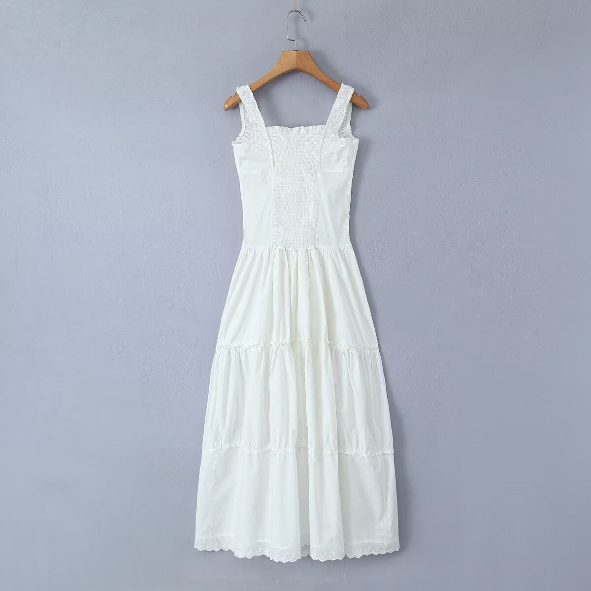 Capture a youthful and fresh look with the White Slim-Fit Patchwork Cami Dress. Made from a premium blend of cotton and regenerated cellulose fiber, this 0.35KG lightweight dress offers comfort and breathability. Featuring a slim-fit silhouette, strapless straight neckline, and sleeveless cami style, it's perfect for daily wear, dates, and summer outings.
